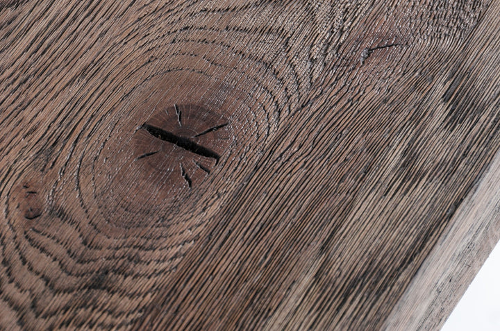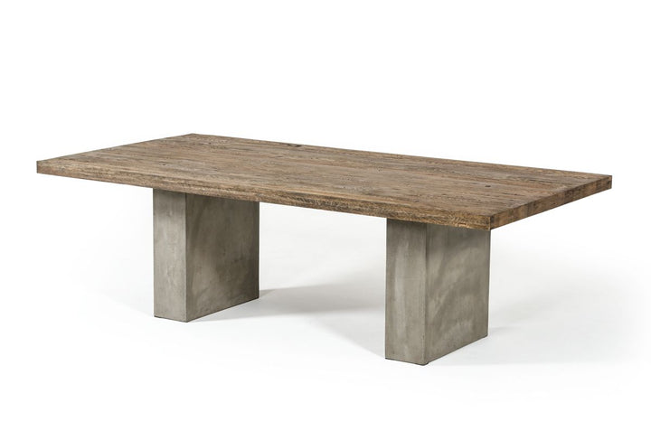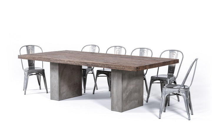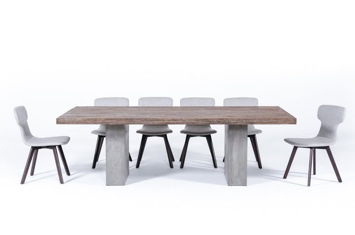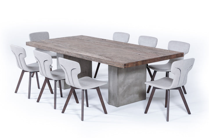 A splendid combination of oak and concrete, the Palermo Modern Oak & Concrete Dining Table exudes an organic elegance. Featuring a rectangular heritage Oak table top with wood markings, it is perched on solid dark grey fiber reinforced natural concrete base. The rawness of the materials used emphasized the eco-friendly feel of this modern dining table that will add warmth to your dining room.