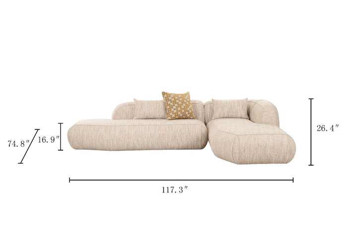 Sculptural, sophisticated, and irresistibly comfortable, the 2-piece Sam Jerry Sectional is the definition of modern luxury. Wrapped in a high-quality tan and beige bouclé fabric, this plush upholstery offers a cozy, cloud-like feel with a warm, neutral palette that adds subtle texture and depth to any space. Accented with vibrant yellow and beige throw pillows, it brings a refined pop of color and inviting charm.
