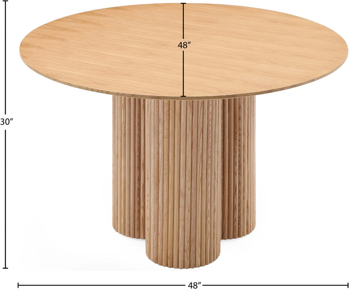 Gather your favorite peeps around the Hargrove dining table. A sleek shade of white, this handsome mid-century designed table has a modish look that's perfect for both contemporary and traditional dining rooms. The natural oak veneer table top measures 60 inches, giving you oodles of room for place settings and lots of elbowroom for dinner guests. Made from ash wood and wood products, this sturdy table has a solid wood fluted base for added aesthetics. Natural Oak Veneer 60" Top Solid Wood Fluted Base Mid-Century Modern Design Dimensions: 48" W x 48" D x 30" H