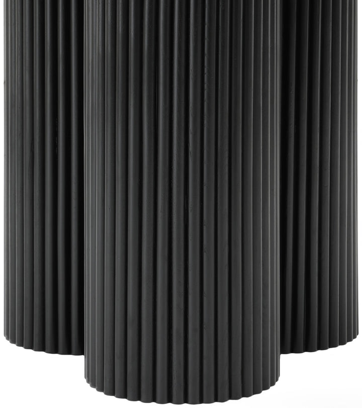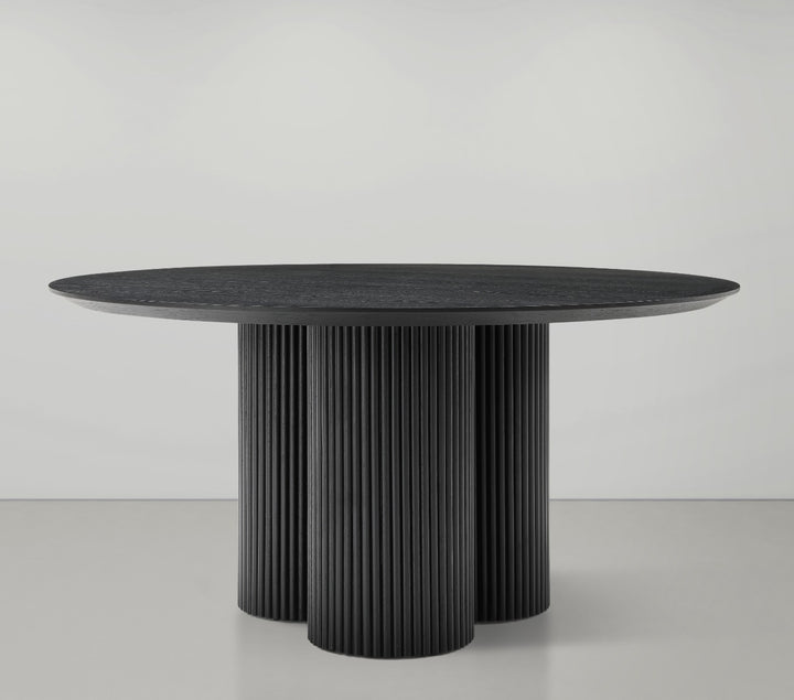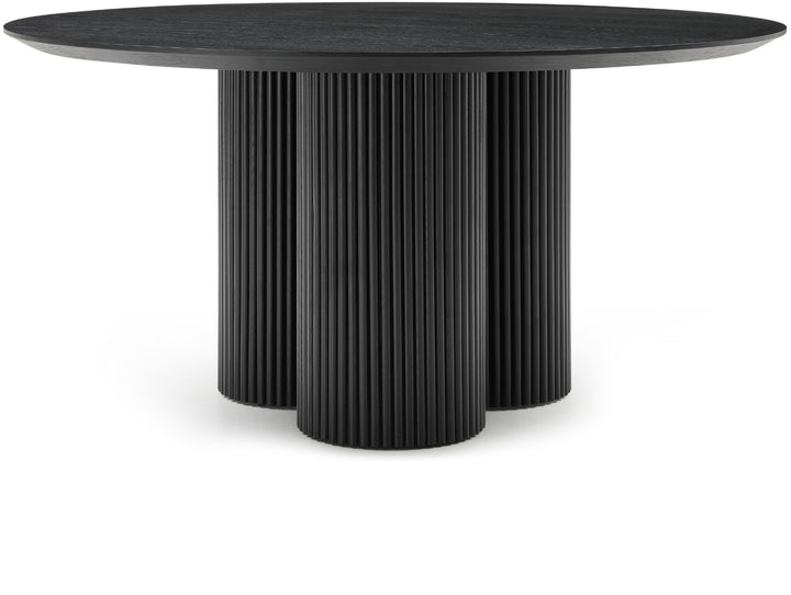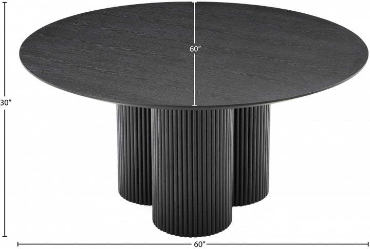 Gather your favorite peeps around the Hargrove dining table. A sleek shade of black, this handsome mid-century designed table has a modish look that's perfect for both contemporary and traditional dining rooms. The black oak veneer table top measures 60 inches, giving you oodles of room for place settings and lots of elbowroom for dinner guests. Made from ash wood and wood products, this sturdy table has a solid wood fluted base for added aesthetics. Black Oak Veneer 60" Top Solid Wood Fluted Base Mid-Century Modern Design Dimensions: 60" W x 60" D x 30" H