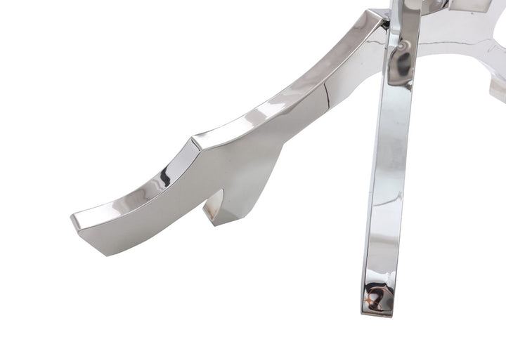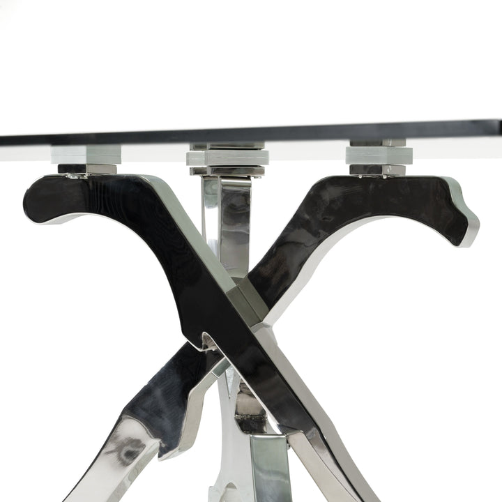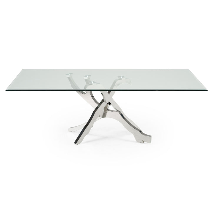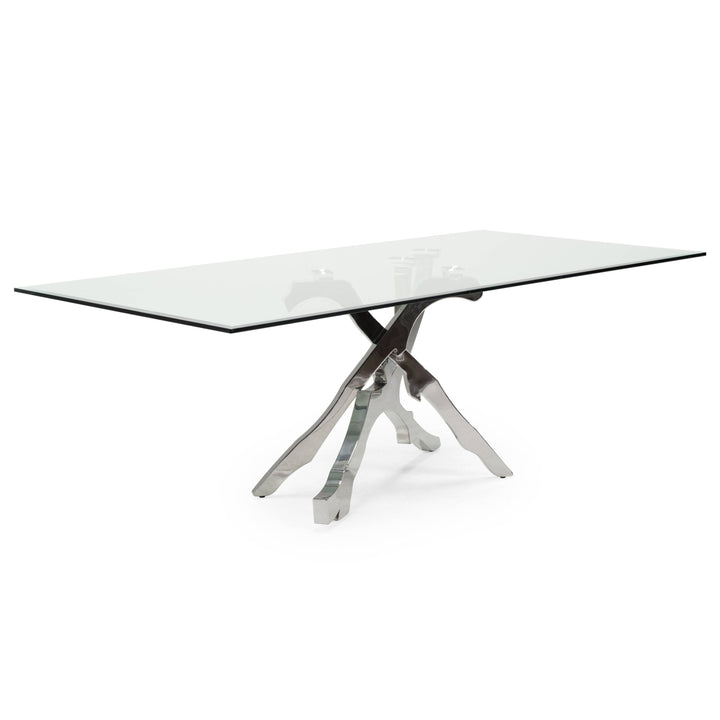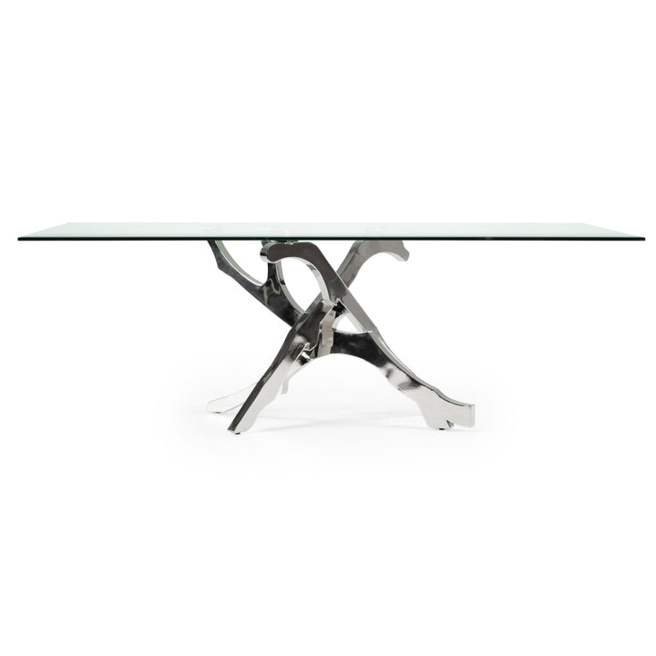 Giving your dining room an urbane stylish look, the Alessio Modern Glass & Stainless Steel Dining Table features a rectangular 15mm clear tempered glass top. Perched on a polished stainless steel base, it can accommodate 6 comfortably. The skillful design of the stainless steel base steals the heart of anyone. Imitating a tree branch, the stainless steel base has rubber stoppers for stability and preventing your floor from scratches.