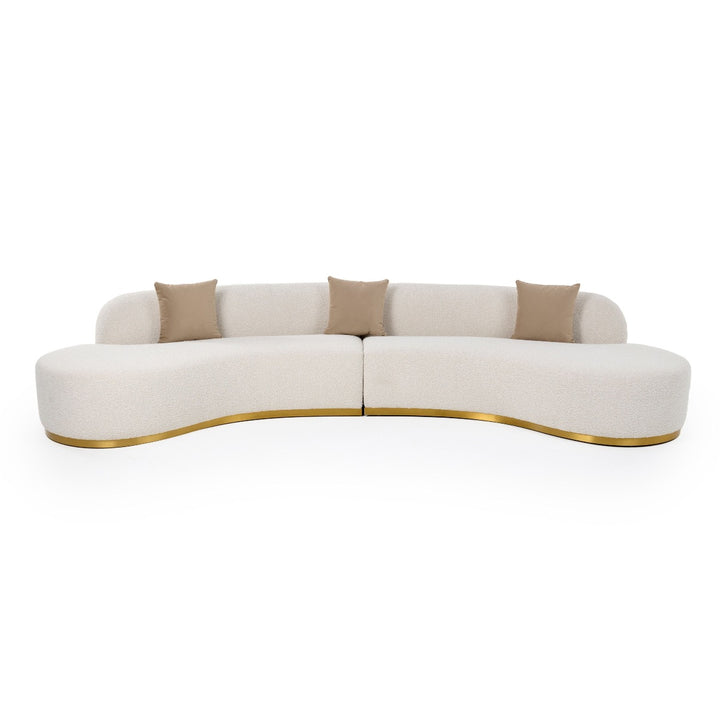 The Arvada Sectional is a stylish modern piece, perfect for a glam or contemporary home. make your home feel like an art gallery with this striking rounded sectional. The beige textured upholstery meets with the gold platform leg to create an enchanting contrast. An example of fine contemporary styles, this sofa is sure to become the star of any show. Overall: W150.4" x D60.6" x H29.1"