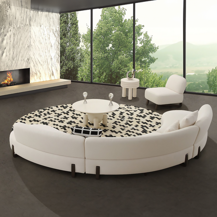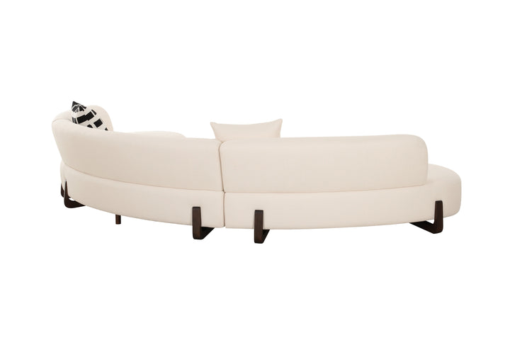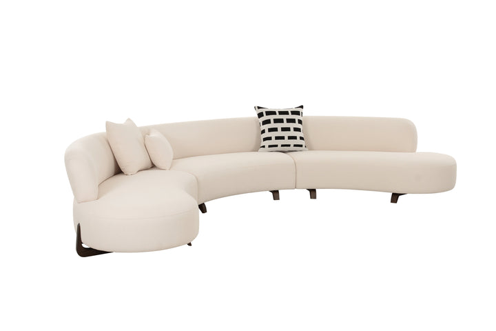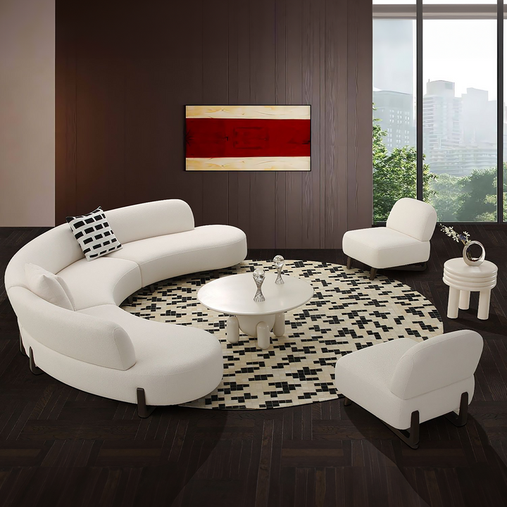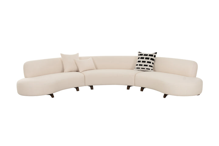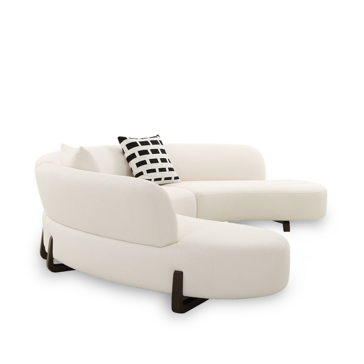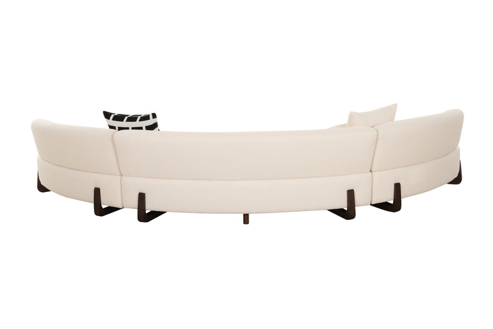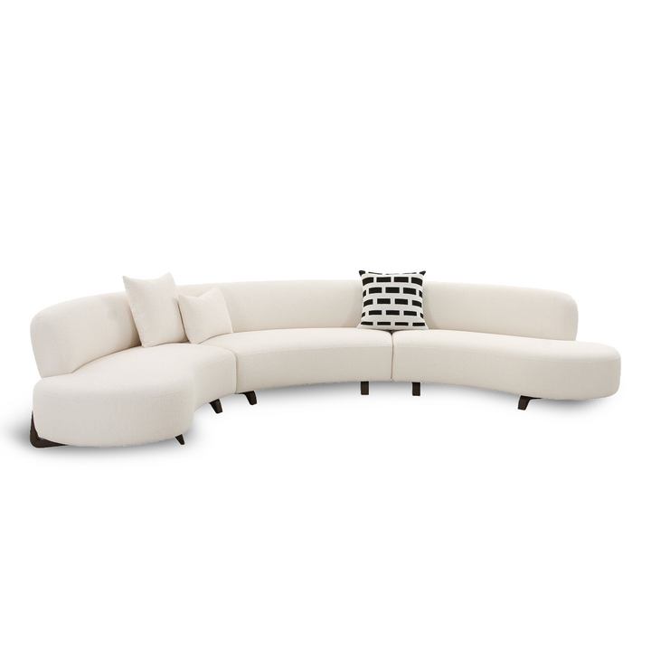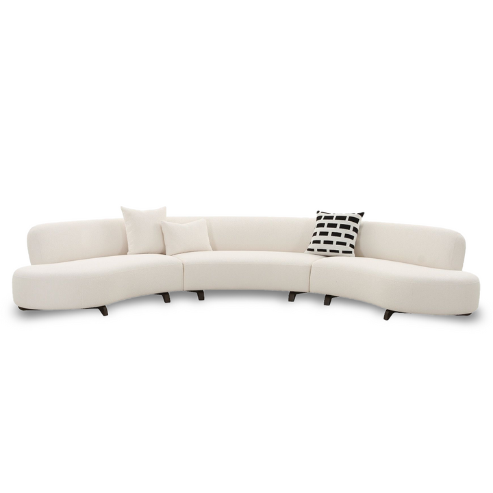 The Baudin 3pc Curved Modular exudes sophistication and chic style with its sensuous curves, low profile seating, and modular configurability. Upholstered in a luxurious white boucle fabric, the contrast with the sleek black wood angular legs is strikingly crisp. The contoured, curved design of the collection is enhanced by the addition of connector brackets, ensuring stability and durability. The gently sloped back adds a touch of elegance to the overall stylish design. With a seat height of 16 inches, this collection offers comfortable seating for various settings. Rest assured with the lifetime warranty on the frame, providing peace of mind and long-lasting enjoyment.