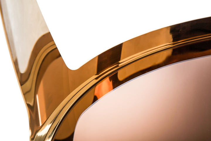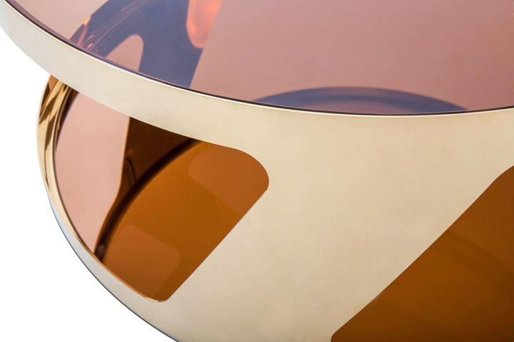 The Chandon Modern Round Gold Coffee Table is an eye-catching piece featuring an elegant round champagne tempered glass top. It features a champagne-mirrored bottom that made it to stand out even more. To complete its luxurious look, it features a golden stainless steel frame. Fully assembled, this stylized modern coffee table has a dimension of.