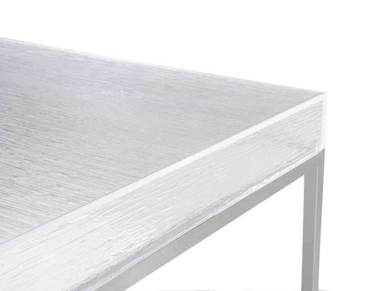 This contemporary cocktail table features a 3.5" high, textured acrylic top that measures 39" x 39". This square shaped top is supported by a polished stainless base, blending a clear look on top with the shiny look of the base.