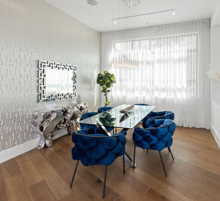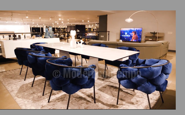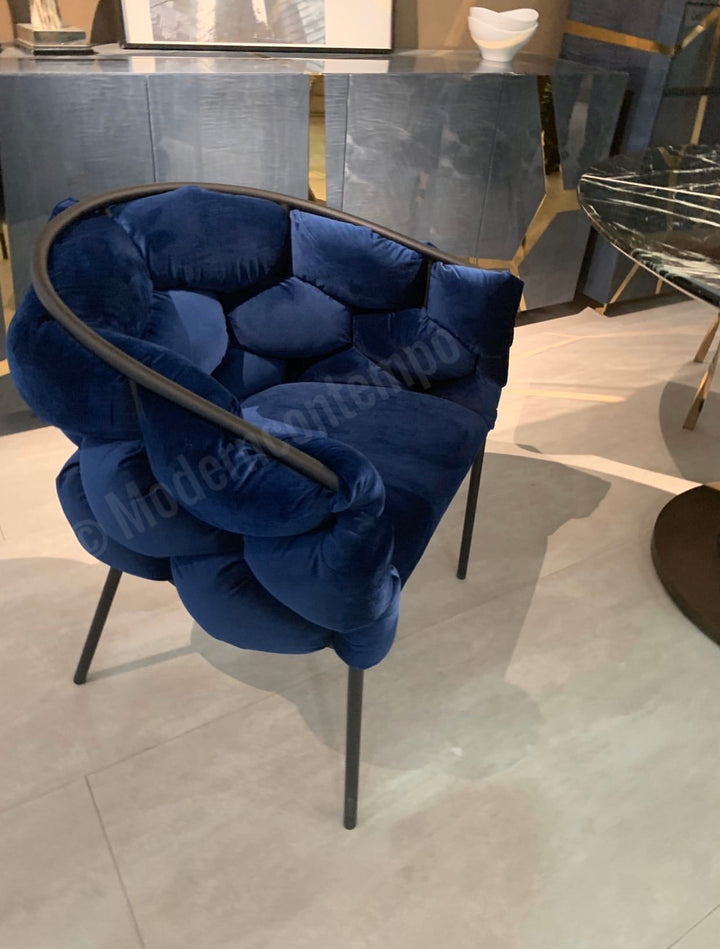 The best designs can take ordinary materials and bring out a visual flair. This is true with the Cinzia Dining Chair, which uses a typical black coated-finish tubular frame chair design and adds both comfort and style with its interlocking hexagonal-cut padded blue velour fabric on its inside and outside back and arms. That blue velour is also used for the nicely padded seat cushion. This dining chair comes fully assembled.