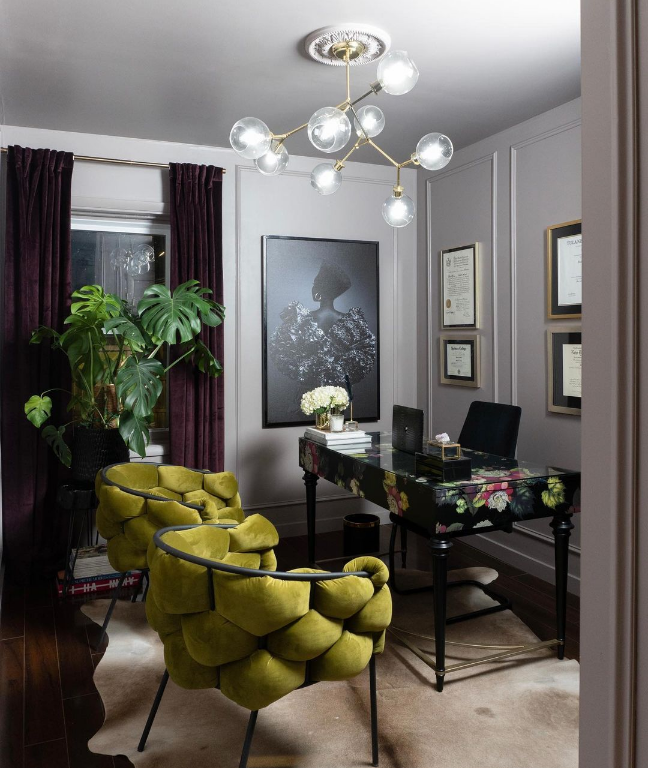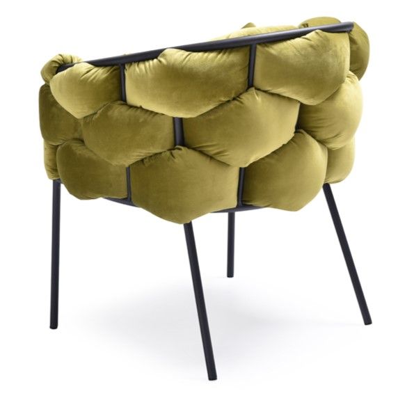 The best designs can take ordinary materials and bring out a visual flair. This is true with the Cinzia Dining Chair, which uses a typical black coated-finish tubular frame chair design and adds both comfort and style with its interlocking hexagonal-cut padded blue velour fabric on its inside and outside back and arms. That blue velour is also used for the nicely padded seat cushion. This dining chair comes fully assembled.