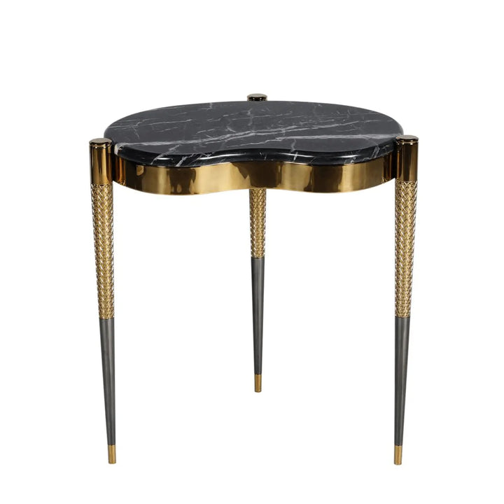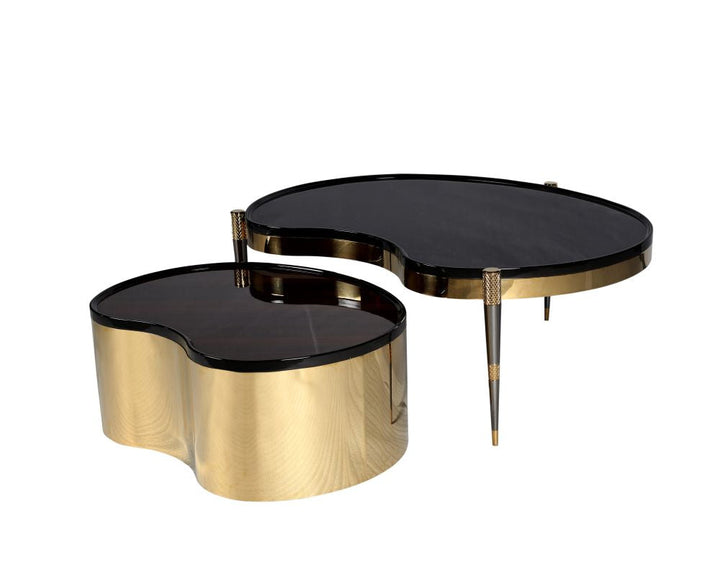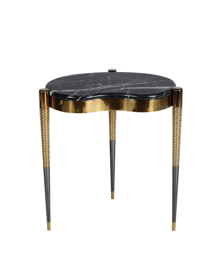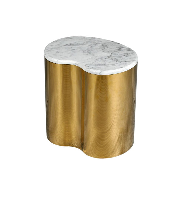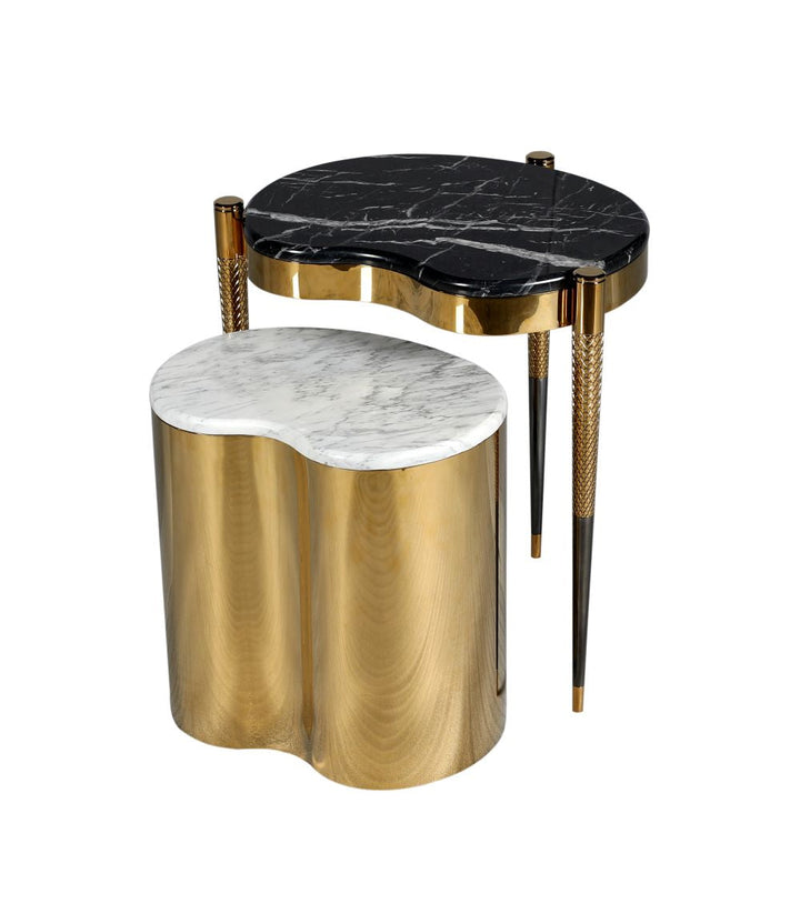 The smaller cyndirical table is adorned with a titanium gold metal coating and a magnificent golden spider marble top. Both pieces are fully customizable, allowing you to choose your preferred marble or metal finish, ensuring a perfect fit for your sophisticated living space.