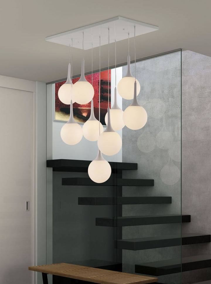 If you're aiming for a winter castle look, you can't do better. The frosted glow of the Epsilon Ceiling Lamp's nine pendant orbs warms up any space. The base is a glossy painted steel with frosted glass shades adding dimension to any room.