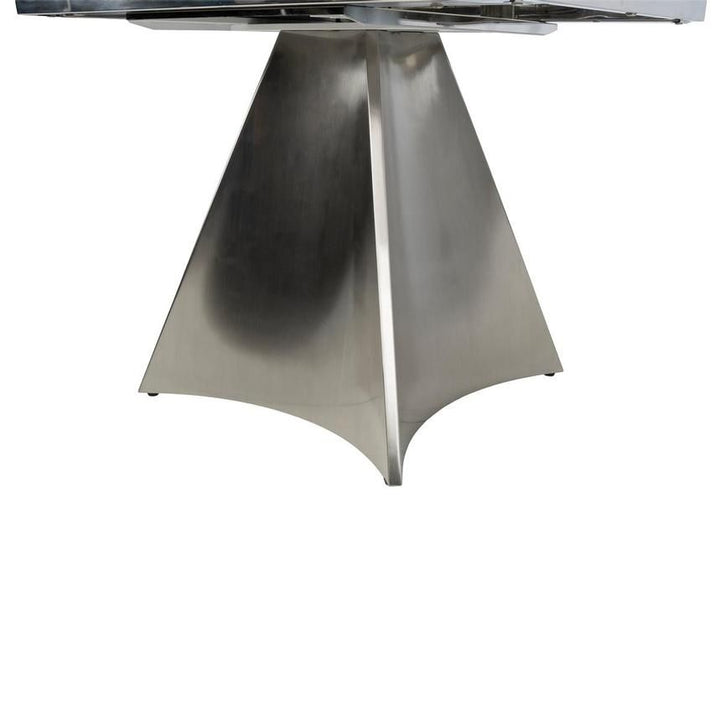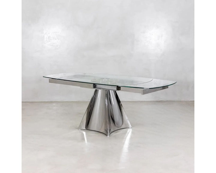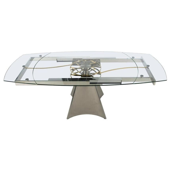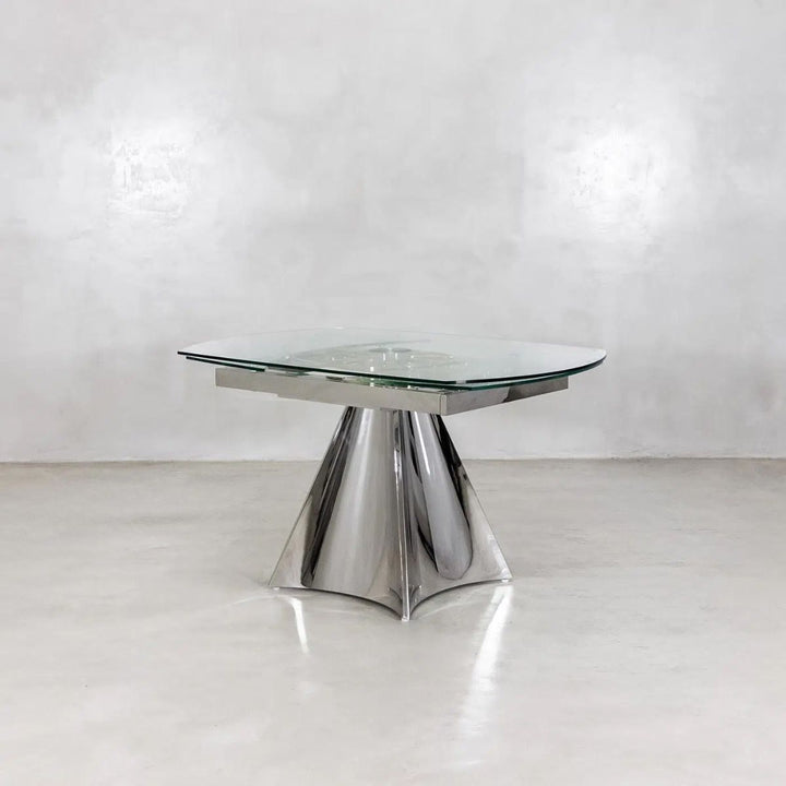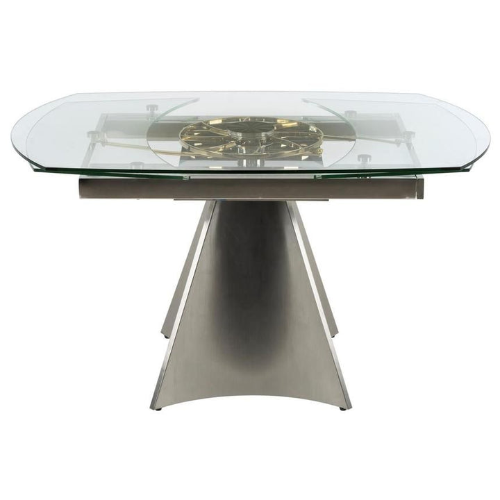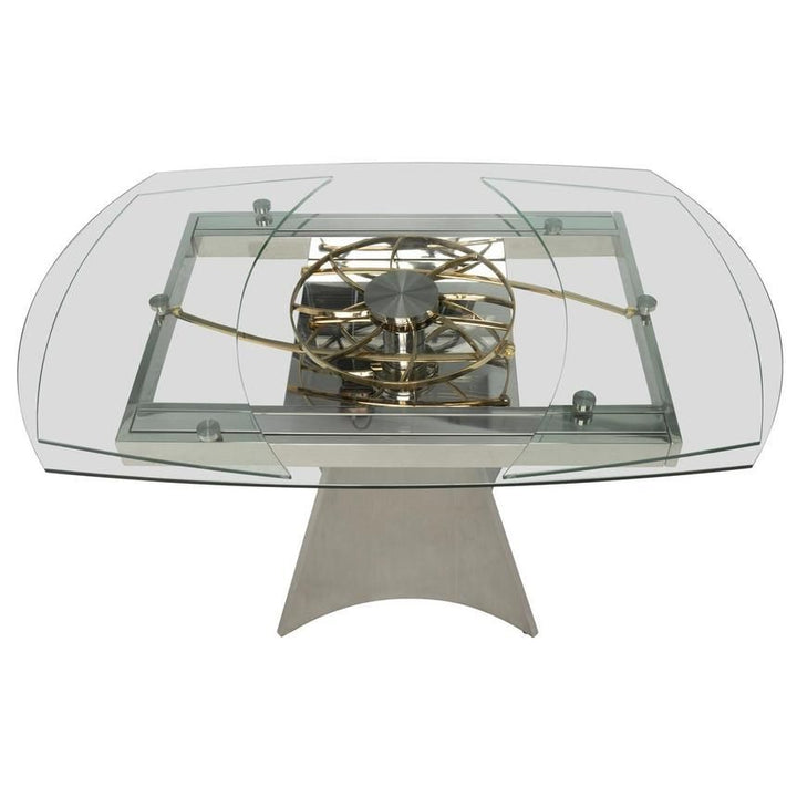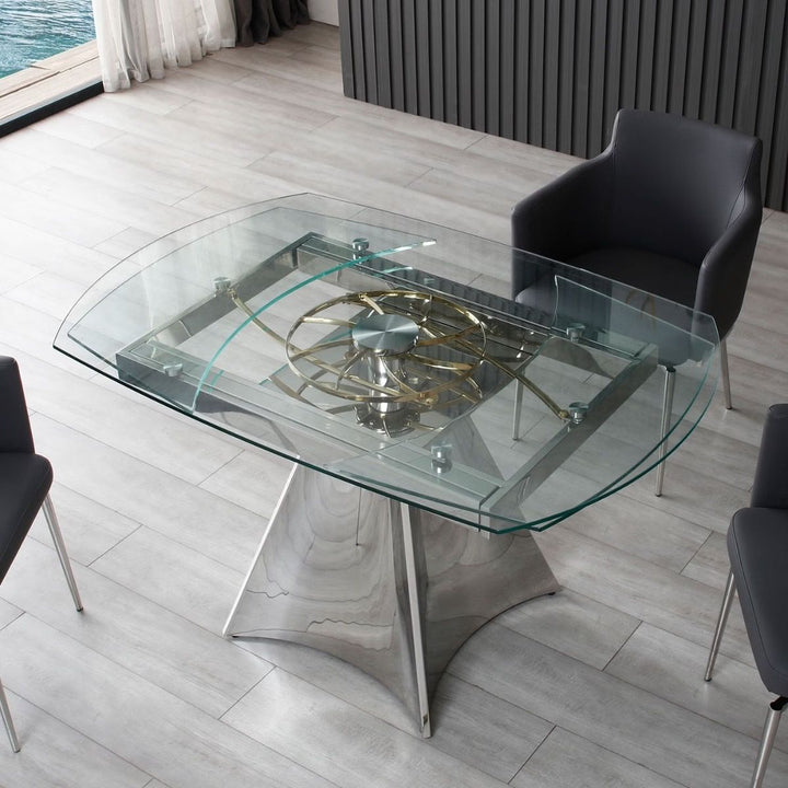 The Equinox Extendable Dining Table is the epitome of modern design. Featuring a sleek, clear tempered glass swivel tabletop, brushed stainless steel base, and elegant golden accents, this stunning piece will captivate your dinner guests. Bold yet inviting, it comfortably seats up to six.
