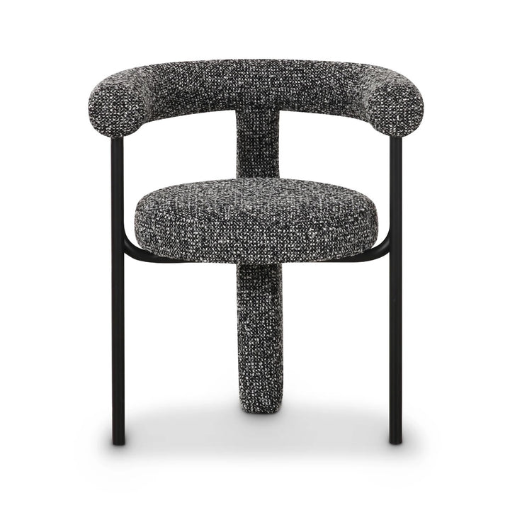 The Flynn Dining Chair brings a postmodern punch to your dining space with its sculptural curves and artful tubular design. Wrapped in textured black performance boucle, its padded shelter back and sleek arms offer a cozy embrace while tucking neatly under most standard dining tables.