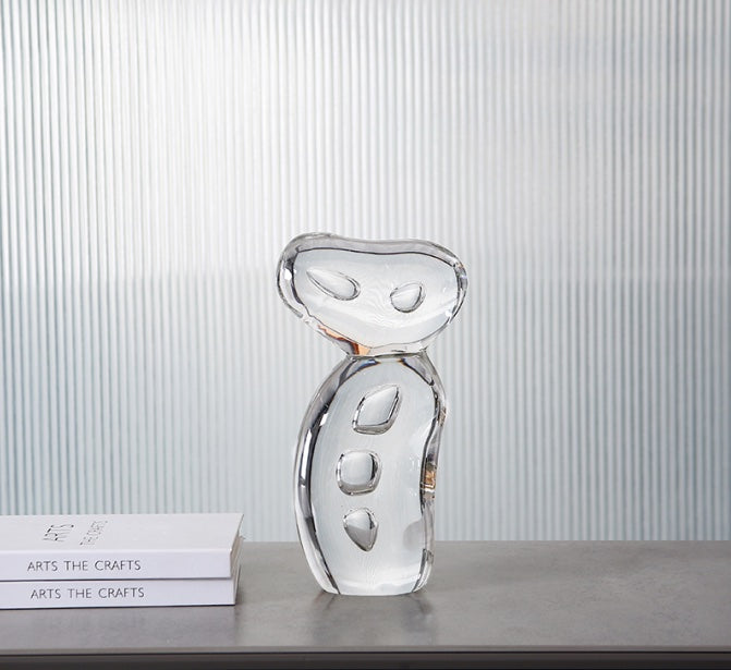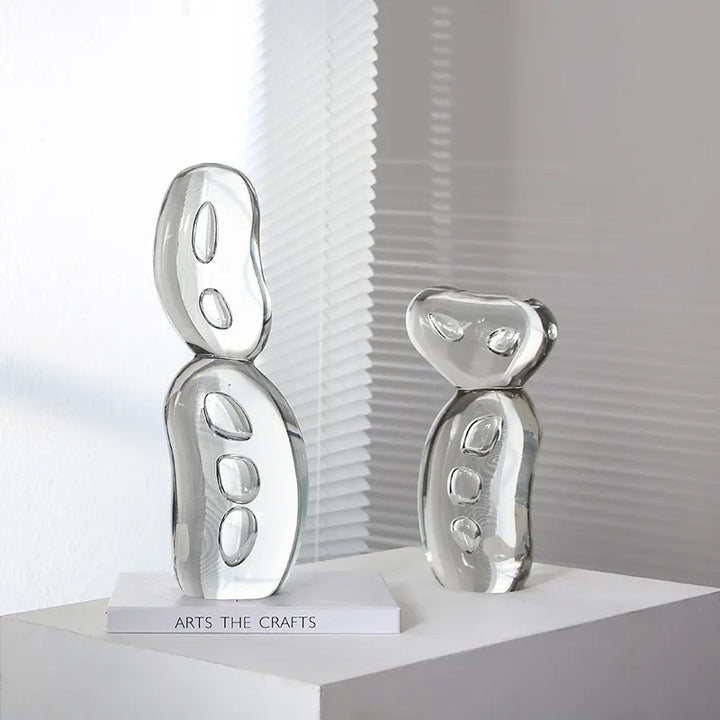 The image shows two similar but distinct pieces of clear, sculptural art, likely made of glass or acrylic.