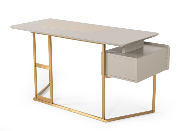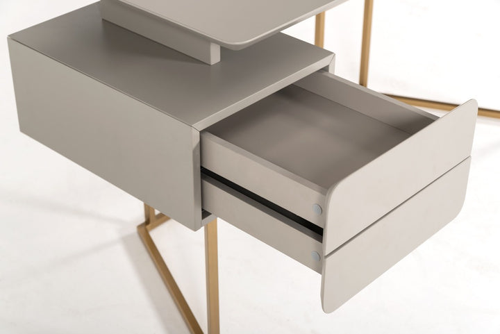 Give your office an elegant modern look with the bronze and matte-grey finish of this desk. The two suspended drawers offer ample storage space for your files, and the metal base provides sturdy support. Matte Grey Finished Top Drawers 2 Drawers Bronze Metal Base Some Assembly Required
