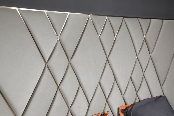Named for the Greek god of sleep, the Hypnos bed will have you feeling relaxed. The high headboard with modern unique design stands tall in any space. Flexible European wood slats sit inside the bed frame and allow air to circulate beneath the mattress. No box spring necessary. Available in Standard King and Queen sizes. Assembly required. Mattress sold separately. The Hypnos Bed is a stylish modern bed with glam materials that brightens up any space. A beautiful beige velvet fully upholsters the frame of this tall bed. Brushed brass inserts create a geometric pattern that adds visual interest. Brushed brass is also accented on the low profile legs. Perfect for a contemporary bedroom. Available in Queen and Eastern King Upholstered in Beige Velvet Stainless Steel Brush Brass Accented Headboard and Base Modern Geometric Designed Headboard Slats Included-No Box Spring Required Assembly Required