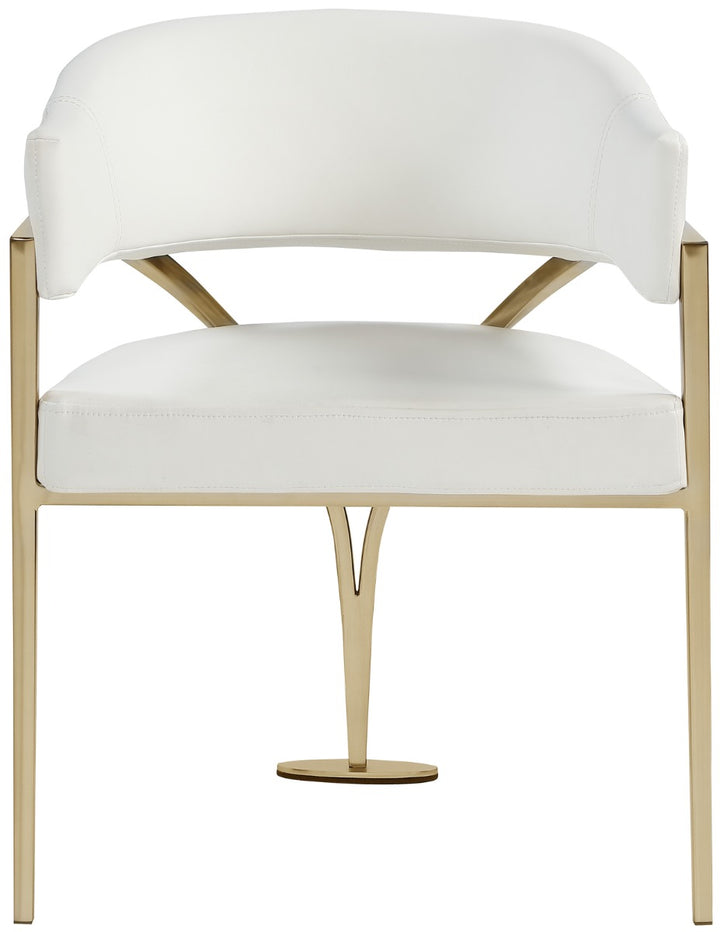 Give your dining area a show-stopping new look when you bring home one or more of these Lenox faux leather dining chairs. The Lenox chair is all about comfort and style with its barrel-back design and its sophisticated lines. Upholstered in luxurious cream faux leather that's inviting to the skin and super soft to the touch, this chair features an iron metal frame for durability and lasting use in your busy home. The brushed brass finish adds a final modish touch to this lovely dining chair. Luxurious Cream Faux Leather Brushed Brass Finish Iron Metal Frame Contemporary Design Dimensions: 23.5" W x 22" D x 30" H Weight: 28 lb. Style: Contemporary Finish: Gold Seat Width: 17.32"Seat Height:18.9"Seat Depth:20.08" Arm Height:27.95"Back Height: 11.02"
