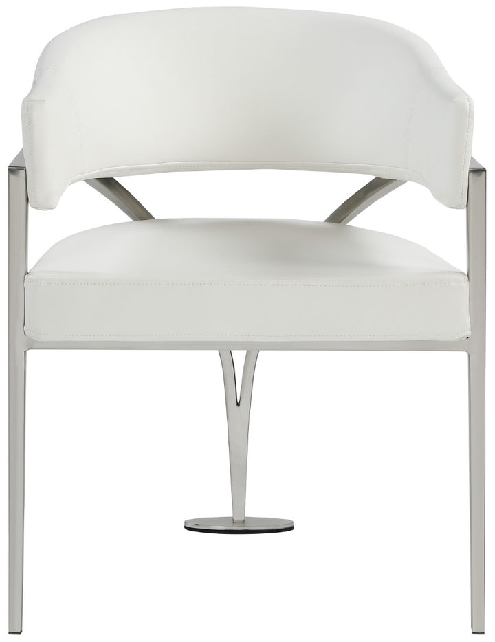 Give your dining area a show-stopping new look when you bring home one or more of these Lenox faux leather dining chairs. The Lenox chair is all about comfort and style with its barrel-back design and its sophisticated lines. Upholstered in luxurious cream faux leather that's inviting to the skin and super soft to the touch, this chair features an iron metal frame for durability and lasting use in your busy home. The brushed brass finish adds a final modish touch to this lovely dining chair. Luxurious Cream Faux Leather Brushed Chrome Metal Frame Contemporary Design Dimensions: 23.5" W x 22" D x 30" H Weight: 28 lb. Style: Contemporary Finish: Silver Seat Width: 17.32"Seat Height:18.9"Seat Depth:20.08" Arm Height:27.95"Back Height: 11.02"