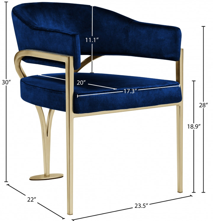 Give your dining area a show-stopping new look when you bring home one or more of these Lenox velvet dining chairs. The Lenox chair is all about comfort and style with its barrel-back design and its sophisticated lines. Upholstered in luxurious navy velvet that's inviting to the skin and super soft to the touch, this chair features an iron metal frame for durability and lasting use in your busy home. The brushed brass finish adds a final modish touch to this lovely dining chair. Luxurious Navy Velvet Brushed Brass Finish Iron Metal Frame Contemporary Design Dimensions: 23.5" W x 22" D x 30" H Weight: 28 lb. Style: Contemporary Finish: Gold Seat Width: 17.32"Seat Height:18.9"Seat Depth:20.08" Arm Height:27.95"Back Height: 11.02"