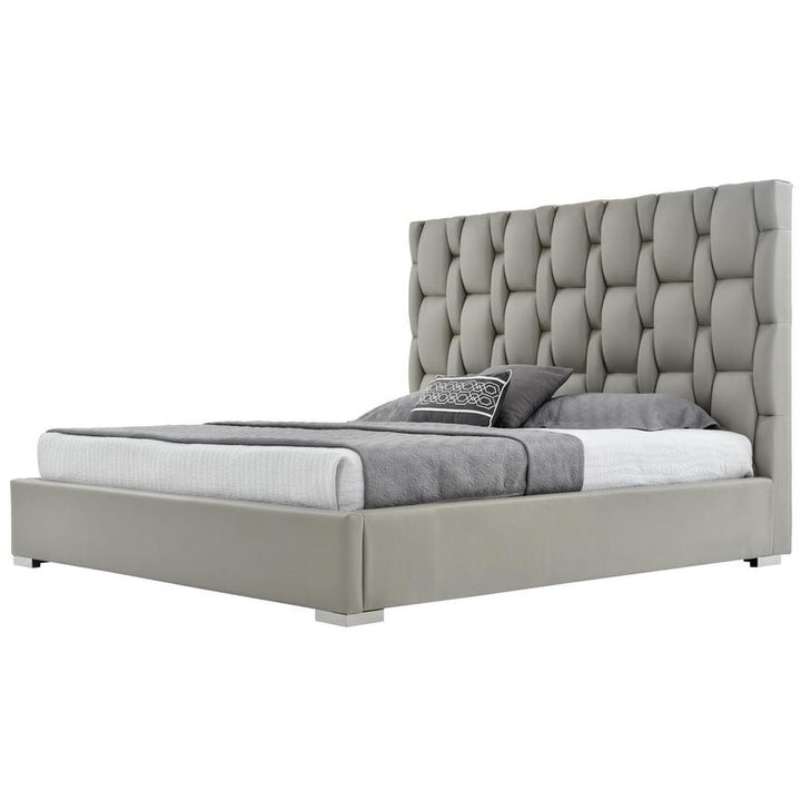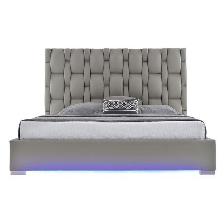 Reinvent the style of your bedroom with the Livia Grey King Platform Bed. The engineered wood construction is upholstered in smooth daisy white leatherette with an oversized headboard that has tufted accents and a unique link style pattern with an LED light strip to create a stunning atmosphere.