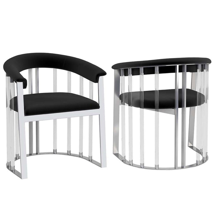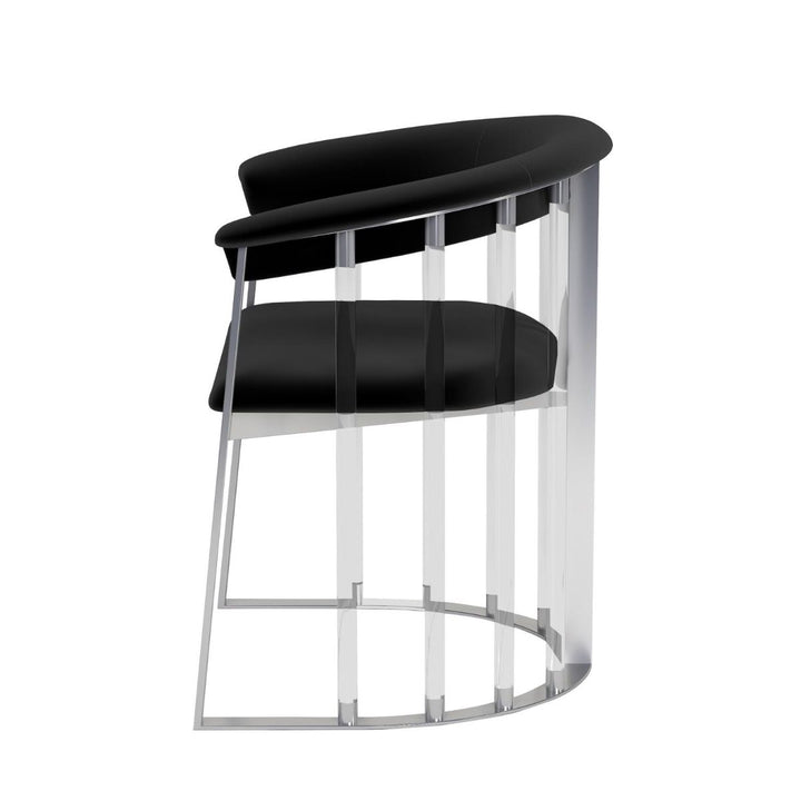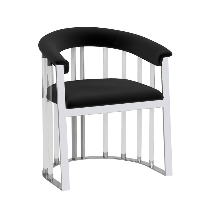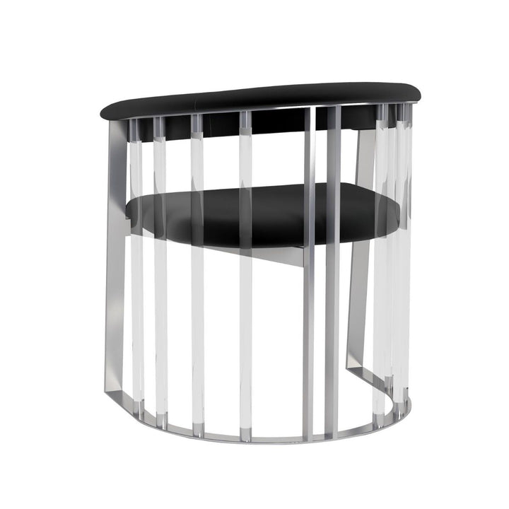 The arc-shaped backrest evokes a feeling of effortless support, while the transparent vertical elements nod to the idea of space, air, and openness, a visual metaphor for elevated thinking and contemporary living. The black upholstered seat and wraparound backrest ground the piece with confidence and poise, offering a rich contrast to the crystalline frame.