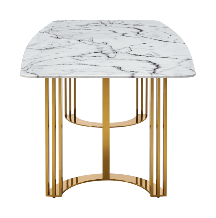 Exclusive Dining Table with Gold Accent Will Give Your Space Rich and Modern Look. Table : Marble Top 12mm & Stainless Steel Gold Color Base Materials: Fabric, Marble and Marble looking, MDF Finishes: Shiny Width:79"Depth:39"Height:30"