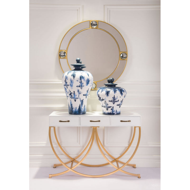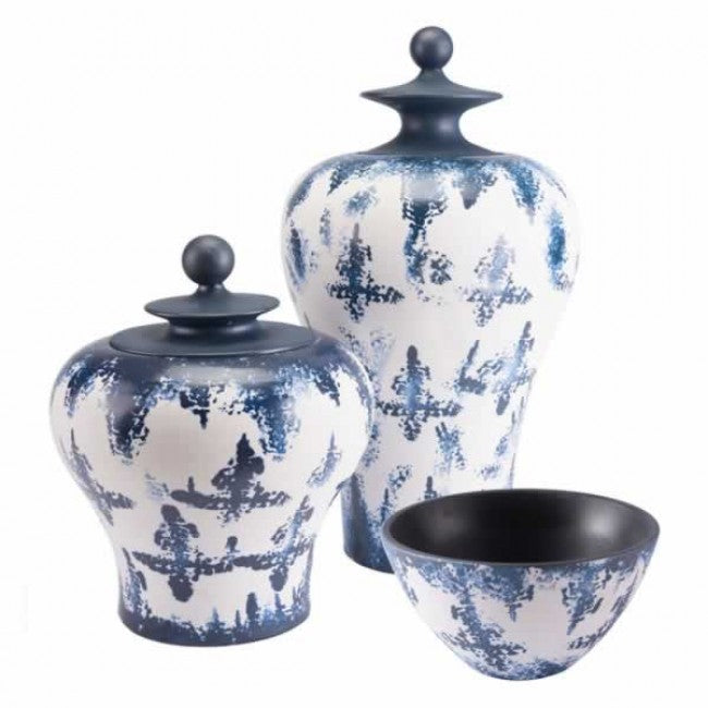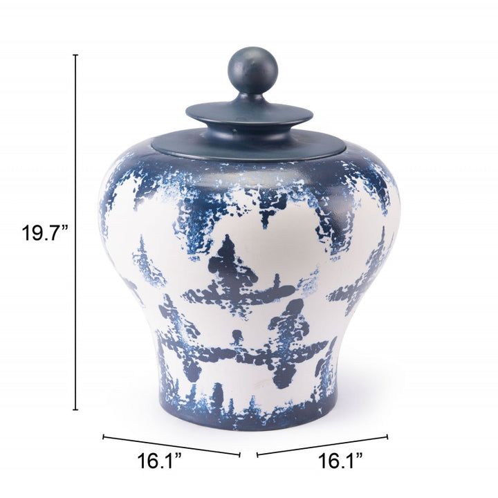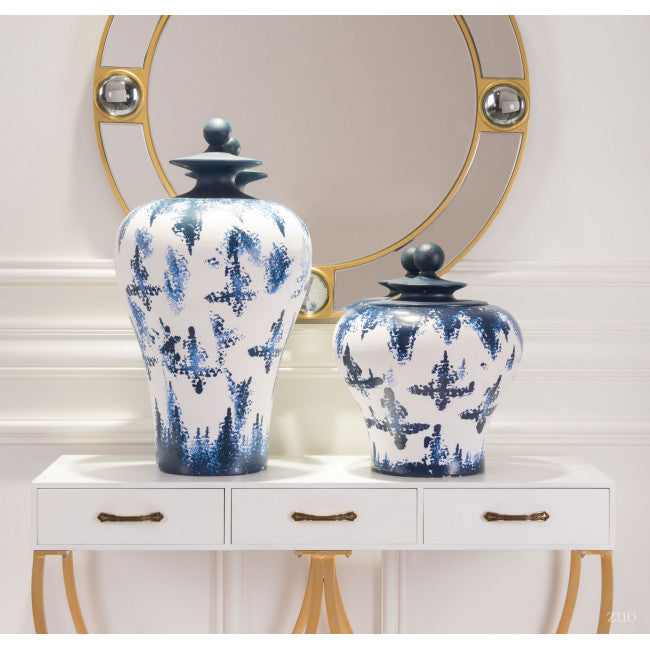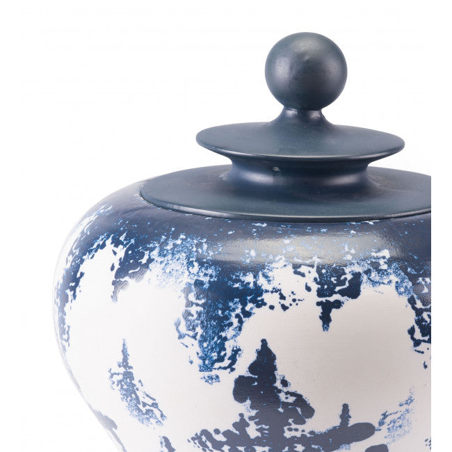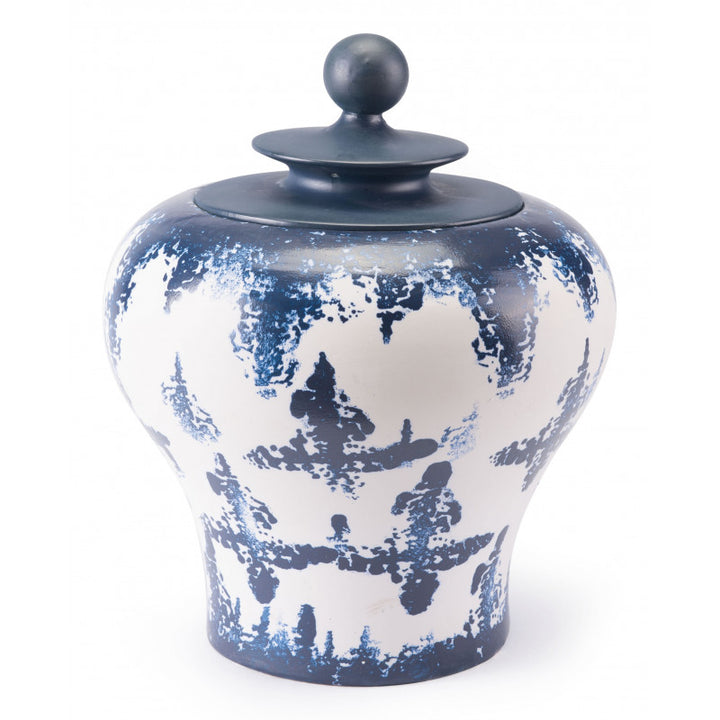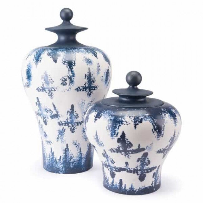 Our Asian-inspired, large temple jar is a gorgeous accent for any room in your home. Resembling work in abstract watercolors, these jars are hand painted in shades of deep blue on white ceramic. The lids are stunning in shape and are painted a solid blue to provide a beautiful contrast.