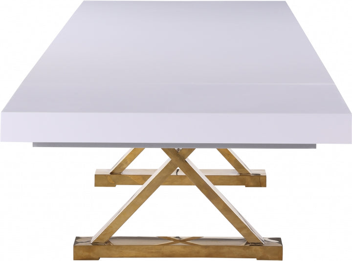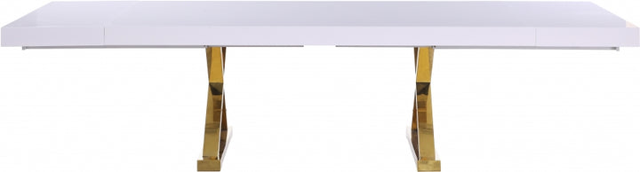 Make room for the whole gang around this Maxi extendable two-leaf dining table featuring a rich white lacquer top and gold stainless steel base. This handsome table is sized just right for family-sized get-togethers, with its extra-long top and oversized design that offers loads of leg room for guests. Inverted X-style legs lend this table a charming look, while the two included leaves make it easy to extend the table or make it smaller for more intimate get-togethers.