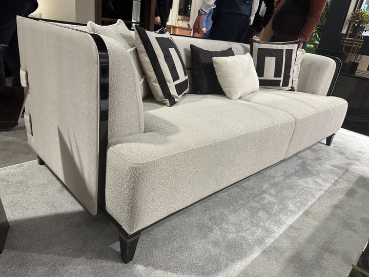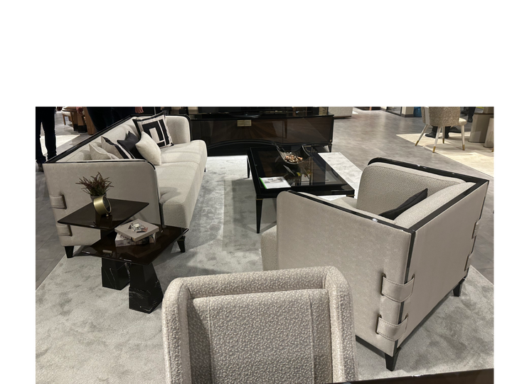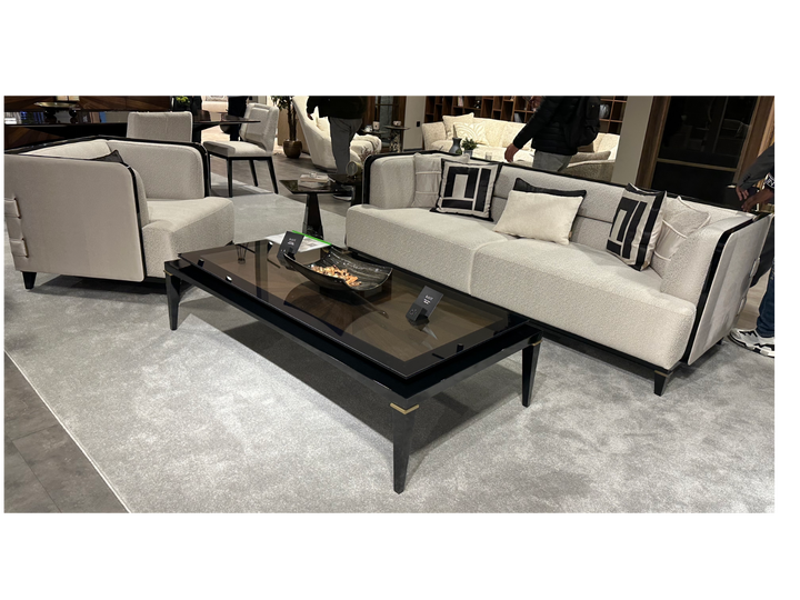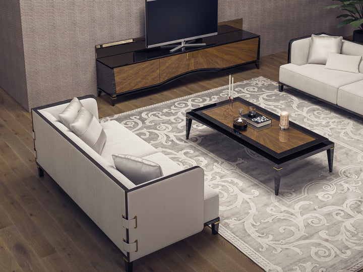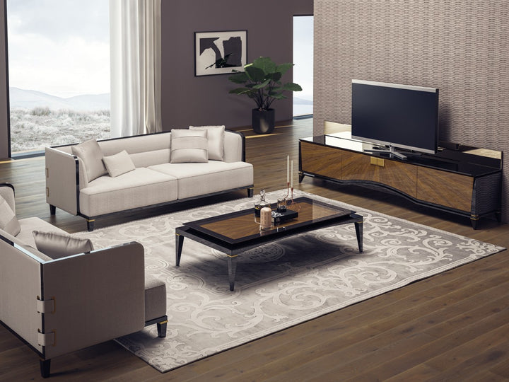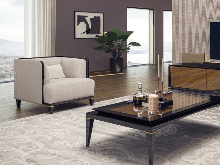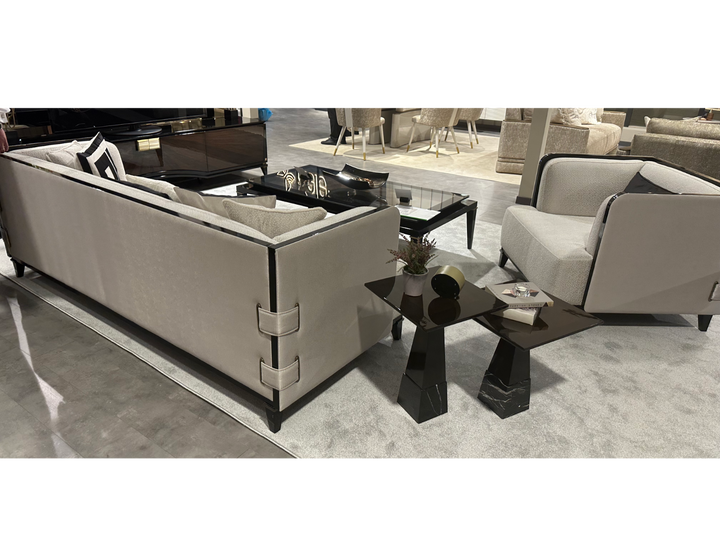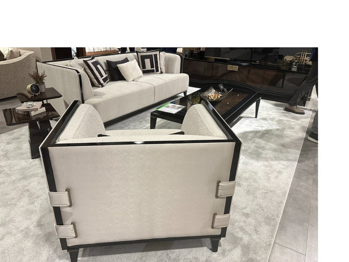 The McQueen offers timeless seating by elevating the perfect strength of wood with the nobility of black. This sofa set, which provides maximum comfort with only the highest quality used in the seating areas, combines elegance and comfort. The legs made of beech wood stand out with their black lacquer and brass tumbled paint details. Beech timber is used for its frame and chenille linen fabric is used for its upholstery.