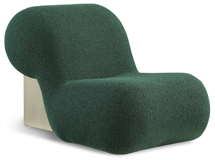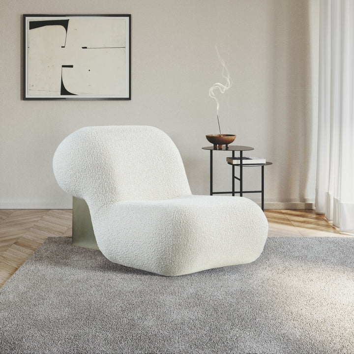 Lounge the day away from the comfort of this taupe Monaco boucle fabric accent chair. Perfect to set a casual vibe in any room, this accent chair offers a slanted back to help you position yourself comfortably for an evening of binge watching your favorite programs. An iron metal frame ensures long-lasting performance while a rich taupe teddy fabric upholstery adds welcoming softness. Rich Black, Taupe, Cream, Green Teddy Fabric Brushed Brass Cube Iron Metal Frame Contemporary Design