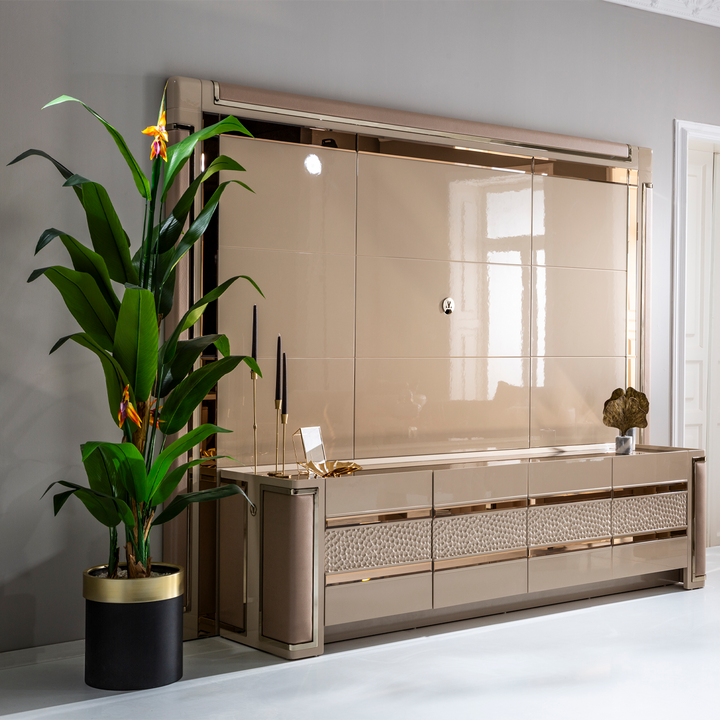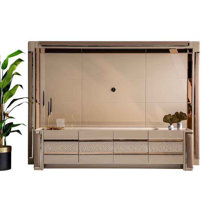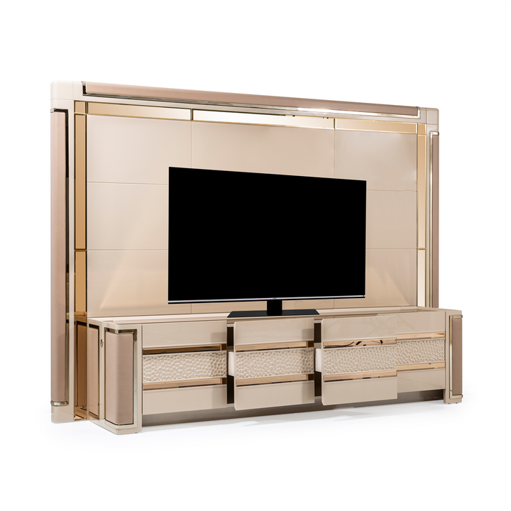 The Montclair Classic Set features a stunning leather and hammered wood sofa, accented with plush velvet pillows, Palladium White Gold touches, and mirrored details. A bold centerpiece, the smoked amber glass coffee table completes the set with refined sophistication. Crafted for those who appreciate artful design and opulent living.