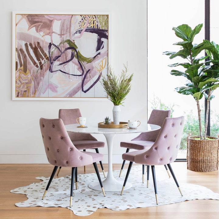If fashion is your passion, then this sophisticated side chair is for you. Make a statement around your table, at your desk or across from your sofa. Its tapered back with button tufting is easy on the eyes and gorgeous from every angle. Slim pencil legs end in brushed brass giving it an elegant finish.