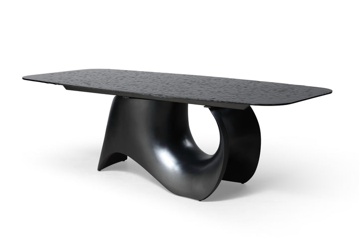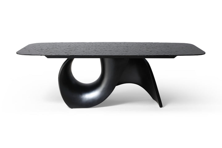 Transform your dining area into a gallery with the Pluto Dining Table. This piece is a masterwork of modern sculpture, featuring a dramatic, fluid base that supports a uniquely textured glass top