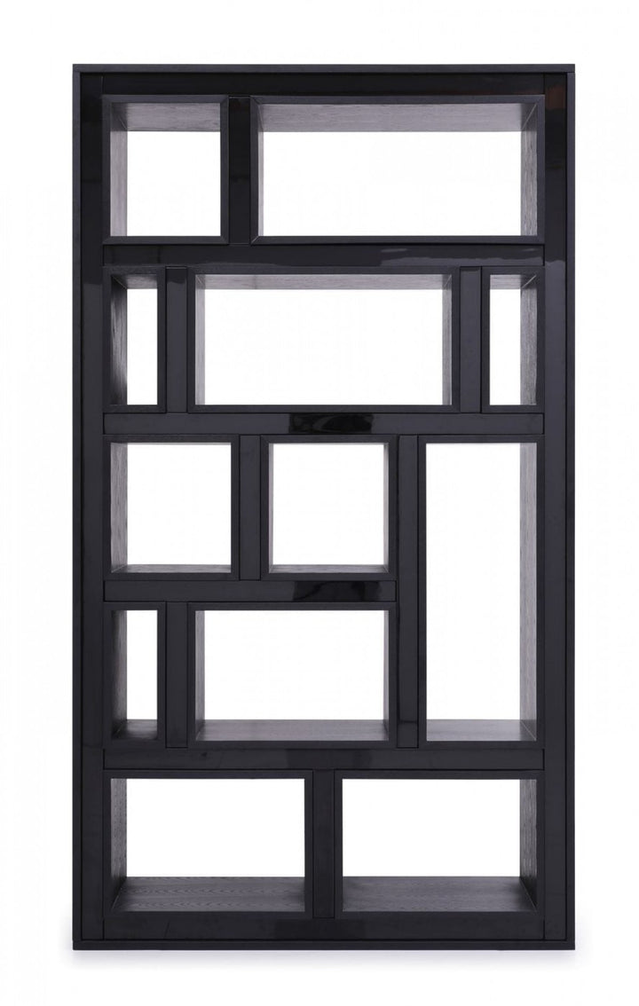 The PRADA Bookcase is the perfect contemporary bookcase for any office or living space. The black high gloss inserts are framed by black ash veneer surrounds that create a contrast of textures sure to pull focus. The open shelving is laid out in a modern abstract format to display items of both form and function. Black Ash Veneer Black High Gloss 12 Open Shelves No Assembly Required