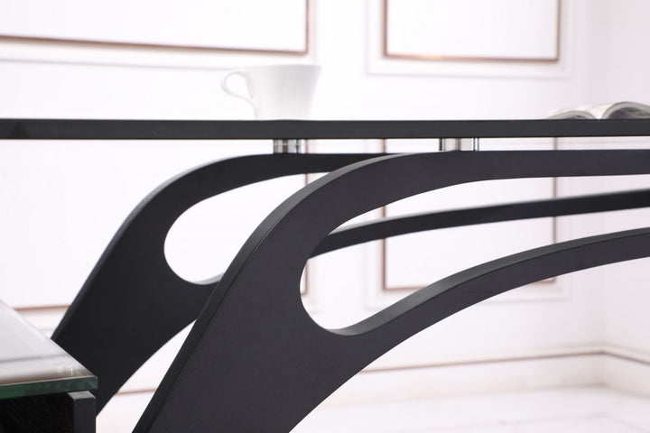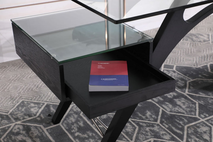 The glass top of the PRADA Desk rest gently on top of it's base, as if floating. The Black Ash Veneer finish and curvalinear supports of the base are bold and elegant. This modern desk has plenty of storage with five drawers and two open shelves. There is plenty of storage and class to be found in this exceptional piece of furniture. Black Ash Veneer and Black High Gloss Clear Tempered Beveled Glass top Chrome Metal supports 5 Drawers 2 open shelves