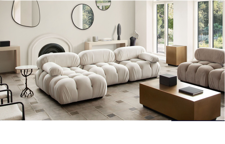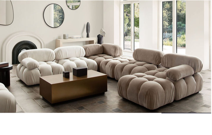 The Pulse Modular Collection is a true blend of form, function and style. With its bubble grid tufted style, carabiner attachment system for Arms & Cushions and plush velvet pleated covering, it oozes a chic sophistication while delivering flexible configuration depending on your spatial requirements. All pieces of the Pulse Collection are available in a Light Cream & Mink Tan Velvet. SET INCLUDES - 1 LEFT CHAIR, 1 ARMLESS CHAIR, 1 RIGHT CHAIR & 1 OTTOMAN.