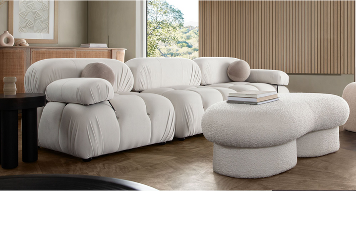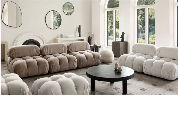 The Pulse Modular Collection is a true blend of form, function and style. With its bubble grid tufted style, carabiner attachment system for Arms & Cushions and plush velvet pleated covering, it oozes a chic sophistication while delivering flexible configuration depending on your spatial requirements. All pieces of the Pulse Collection are available in a Light Cream & Mink Tan Velvet. SET INCLUDES - 1 LEFT CHAIR, 1 ARMLESS CHAIR, 1 RIGHT CHAIR.