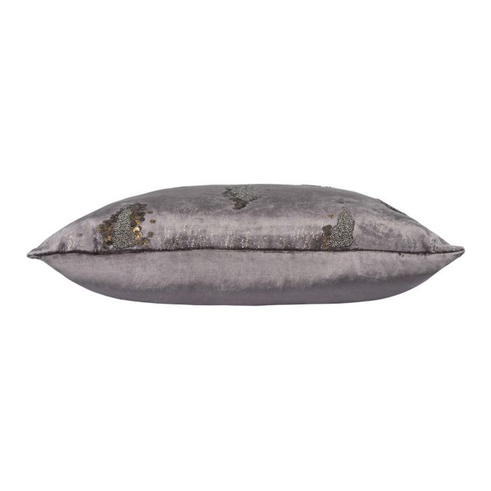 Raina charcoal pillow with hand embellished gold sequins around pockets of grey velvet. Disclaimer : Product color may slightly vary due to photographic lighting sources or your display settings. Please follow specific care instructions.