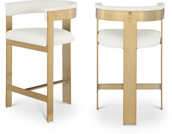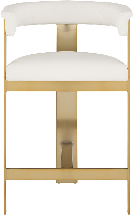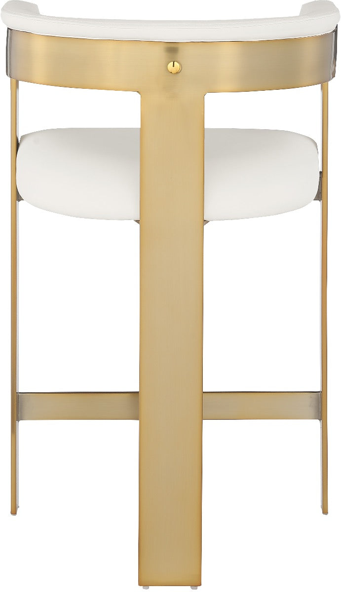 Choose these cream Romeo vegan leather stool to give your dining room an instant refresh. These stools feature cream vegan leather upholstered seats and backs, adding a modern touch to your space. The brushed gold metal frames offer an elegant contrast while ensuring durability. With sleek curved backs, these stools ensure comfort while enjoying a refreshing drink or meal. A cozy, chic seating solution for you and your guests, this stool will elevate any room's look.