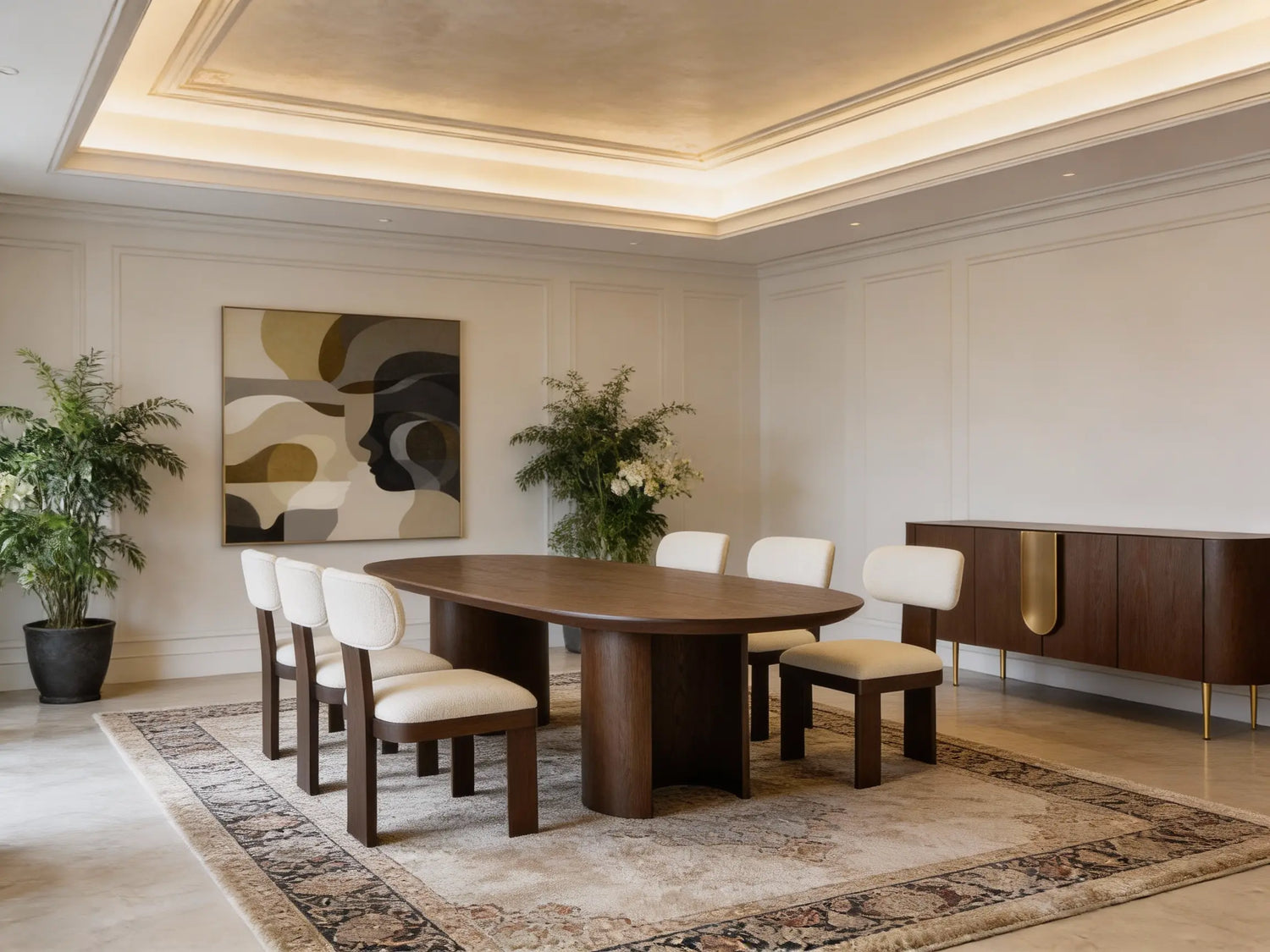 The San Mateo Oval Dining Table balances sculptural form with timeless craftsmanship. Designed and assembled in the United States, each-Piece is artisan crafted and hand finished to enhance the natural warmth of caramel oak. Its elongated oval silhouette softens the dining space, while twin column bases create a bold architectural foundation.