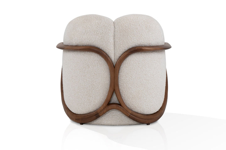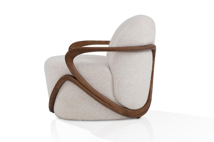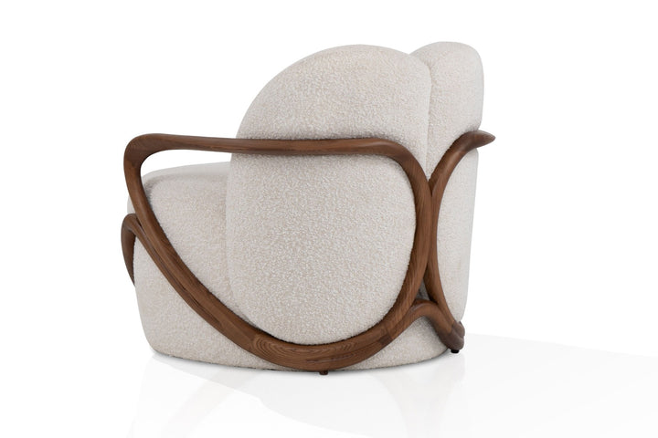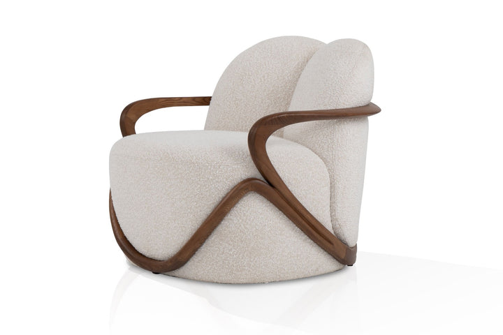 Make a sophisticated statement with this architecturally inspired armchair. Blending soft, tactile upholstery with dramatic, flowing wooden lines, this chair is a true piece of functional art perfect for a high-end living room, study, or master bedroom.