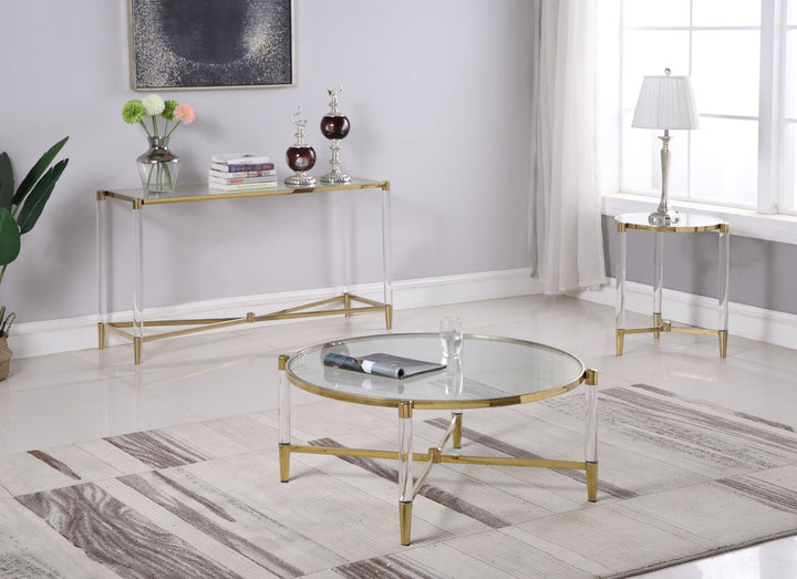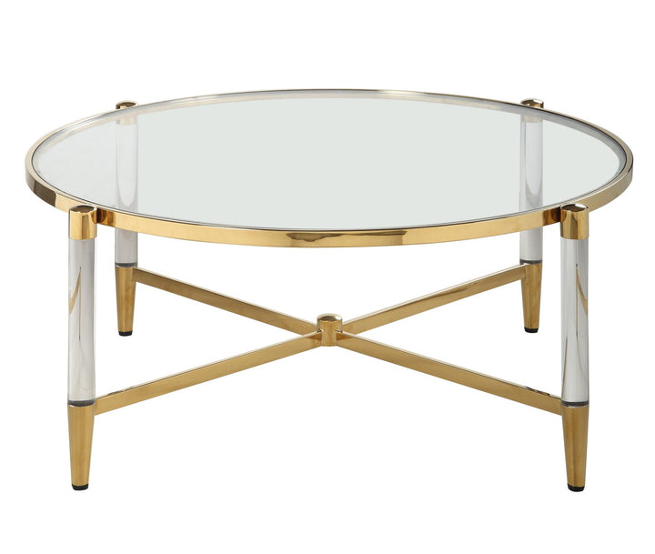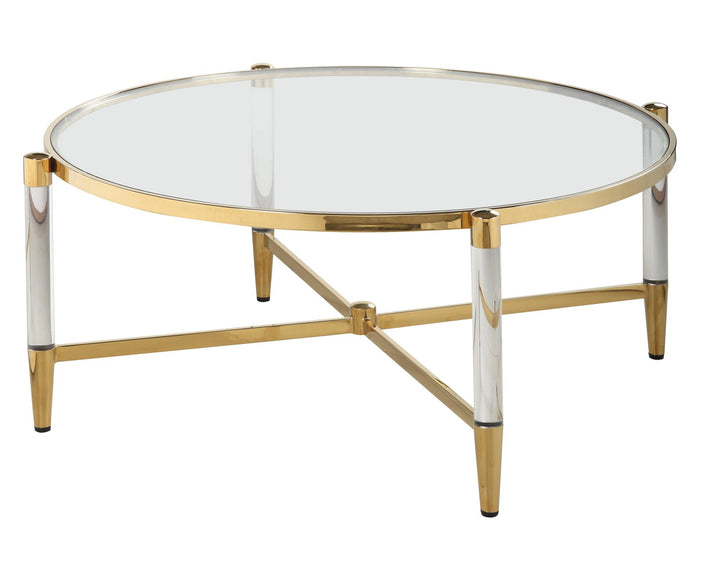 Anchor your seating area with the Squisito Round Coffee Table, a stunning piece that radiates Hollywood Regency glamour and effortless style. Its transparent and metallic construction is designed to maximize light and visual space.