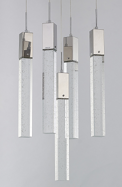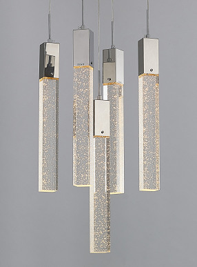 A FLUSHED CHROME FRAME CHANDELIER WITH HANGING CLEAR BUBBLE BLOCK CRYSTALS This chandelier has a chrome metal frame It comes with clear bubble block crystals The cord length is adjustable and provided with 78" of hanging wire. Size : L13.78'' W13.78'' H19.6'' Lamp : 5/GU10/5W