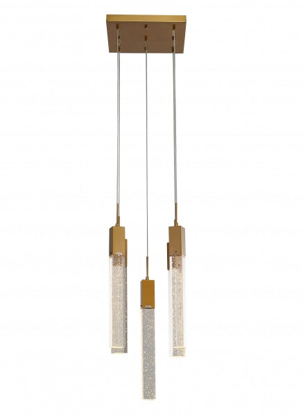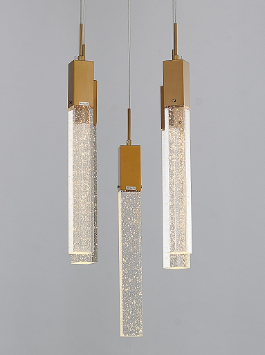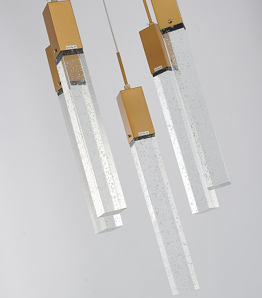 A FLUSHED GOLD FRAME CHANDELIER WITH HANGING CLEAR BUBBLE BLOCK CRYSTALS This chandelier has a gold metal frame It comes with clear bubble block crystals The cord length is adjustable and provided with 78" of hanging wire. Size : L13.78'' W13.78'' H19.6'' Lamp : 5/GU10/5W