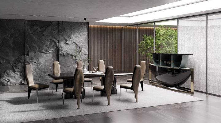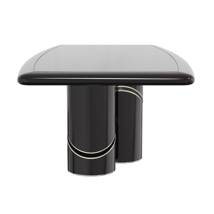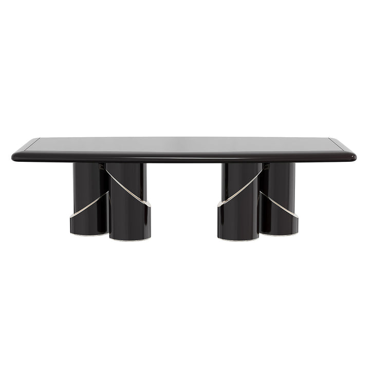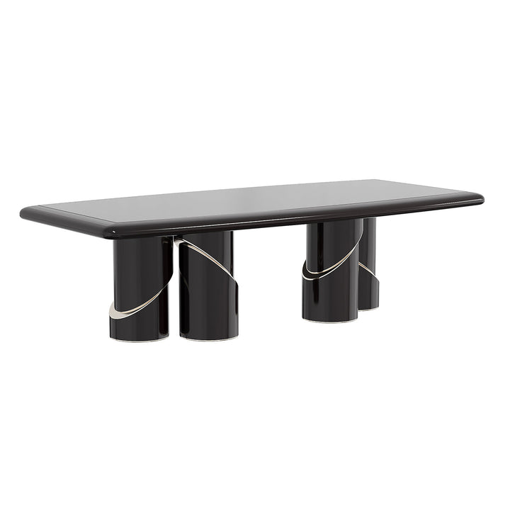 The Trezano Rosa is a luxurious dining table, meticulously crafted from walnut wood veneer enhanced with a high-gloss acrylic polyester coating. Its stainless steel elements are elegantly finished with titanium gold. Made in Europe.