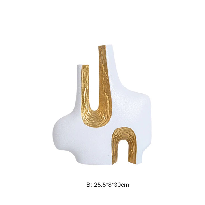Embrace the beauty of gold highlighted in these dramatic vases. The Shape of each one creates a bold artistic statement in any space. Can be displayed alone or together