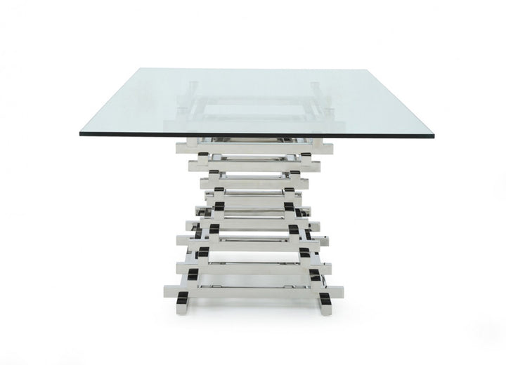 The Zuliana Contemporary Glass Rectangle Table features an enticing tiered chrome stainless steel base that supports the 15mm smoke tempered glass top. Requiring some assembly, this dining table can accommodate 4 people comfortably and has a dimension of W87" x D43" x H30".