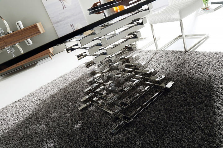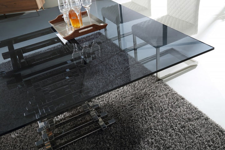 The Zuliana Contemporary Glass Square Dining Table features an enticing tiered chrome stainless steel base that supports the 15mm smoke tempered glass top. Requiring some assembly, this dining table can accommodate 4 people comfortably and has a dimension of W59" x D59" x H30".