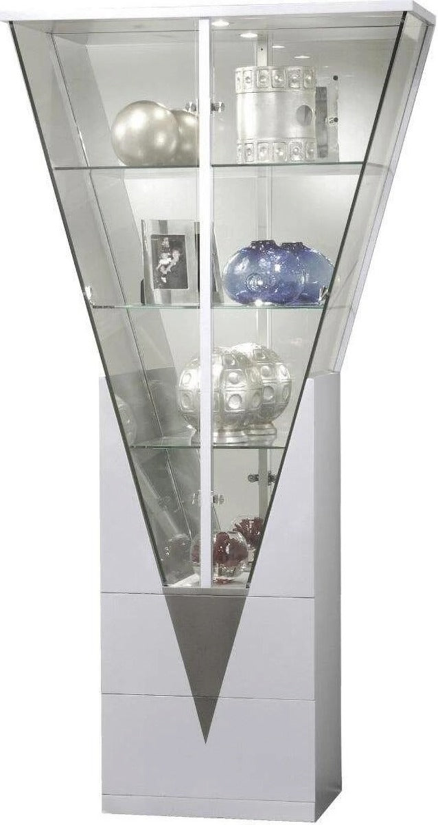 Large triangular shaped curio cabinet in Silver. It features glass shelves, a mirrored back, magnetic closure on the front glass doors and an interior light. All glass is tempered.
